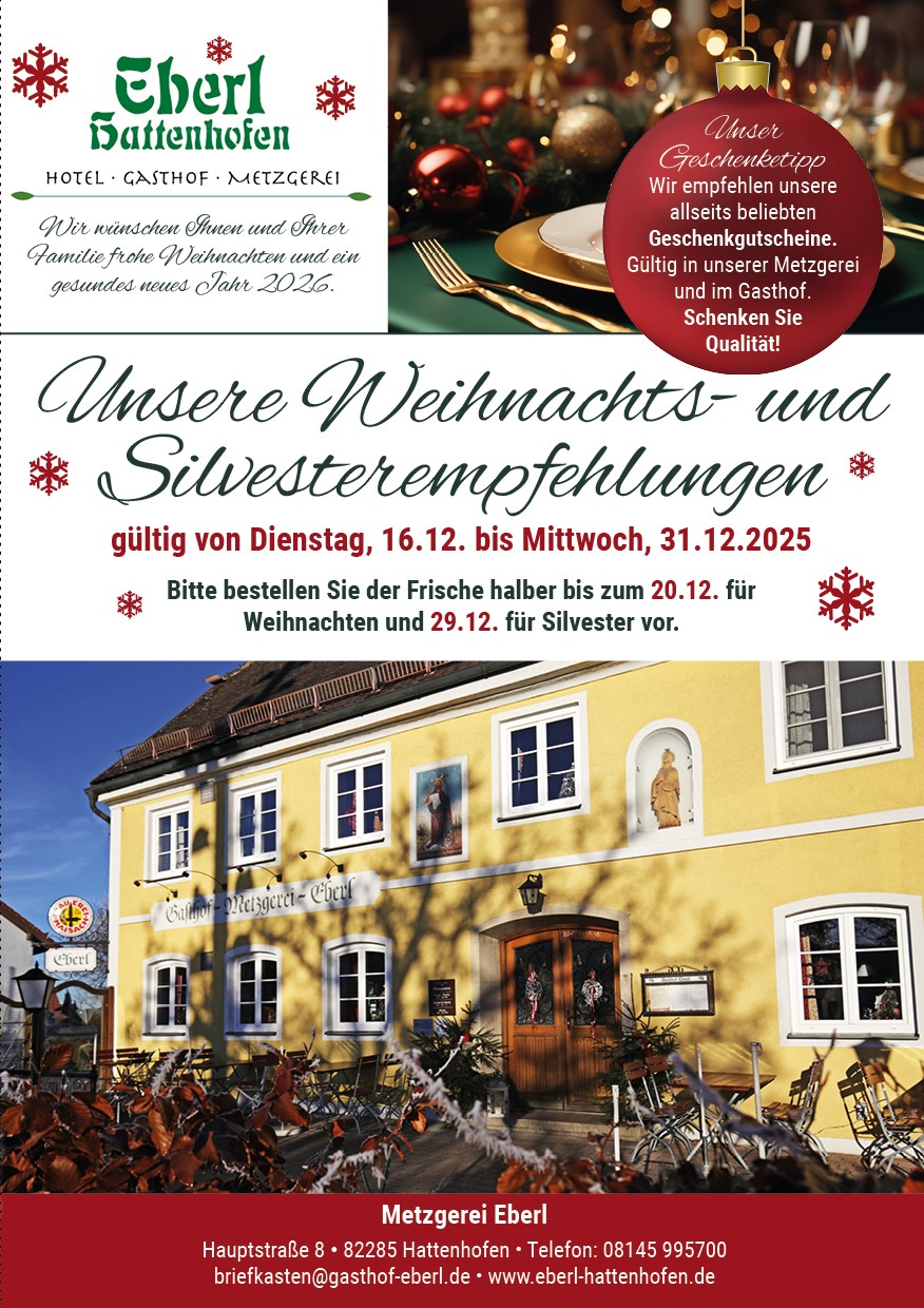 Die Metzgerei Eberl hat dieses Jahr zum ersten Mal ein Adventsfenster gestaltet. Hierzu laden wir Sie / Euch recht herzlich von 17 bis 20 Uhr ein, zu einem vorweihnachtlichen Beisammensein bei Glühwein & Krautschupfnudeln. Über eine Geldspende freuen wir uns, diese geht zu Gunsten der Aktion Sternstunden e.V. des Bayrischen Rundfunks.